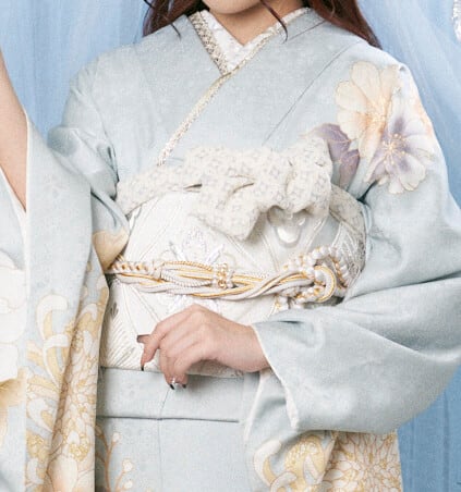 上品でさわやかな水色の振袖。寒色の淡い色味だけどさみしくならないのは、白い花の大輪が華やかさをそえてくれるから。色味×柄のバランスが絶妙な、儚い女の子になれちゃう振袖コーデ♡